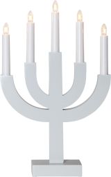 Röd träljusstake med 5 ljuskällor, lätt att placera då den är liten i storleken. Skapar en härlig julstämmning både i fönster och inne i rummet på tex en hylla eller skänk.