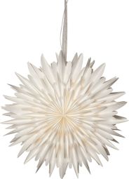 Vit stjärna med svart fot. Elegant juldekoration, lätt att placera och passar utmärkt i ett fönster eller på en skänk. Stjärnan har plats för en ljuskälla med E14 sockel. Höjden är 55cm. Sladd 180cm med strömbrytare.