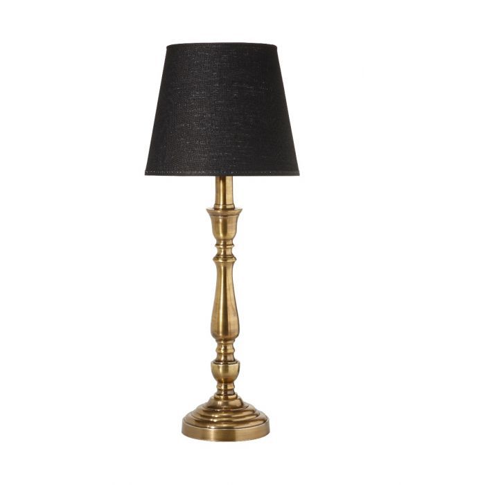 Snyggt svarvad lampfot i metall med tillhörande textilskärm. Lite större lampa som passar bra som bordslampa eller som fönsterlampa i ett större fönster. 51cm hög och 20cm i diameter. Plats för 1st E27 ljuskälla 40W. Ingår ej.