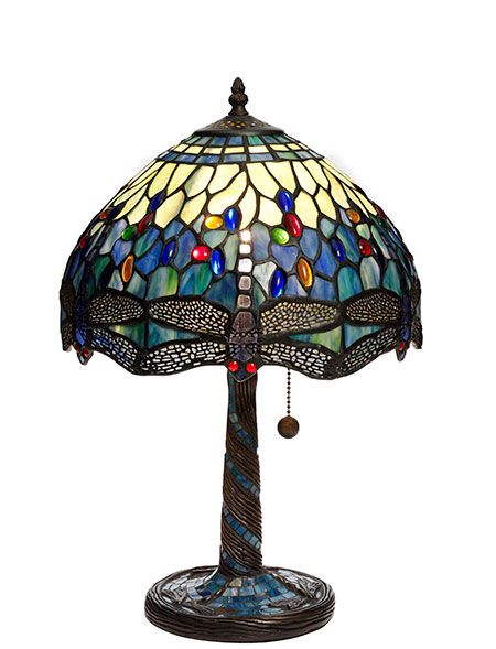 Denna Tiffany lampa har en glasskärm i färgerna safirblå,turkos, röd, cognac, grön.