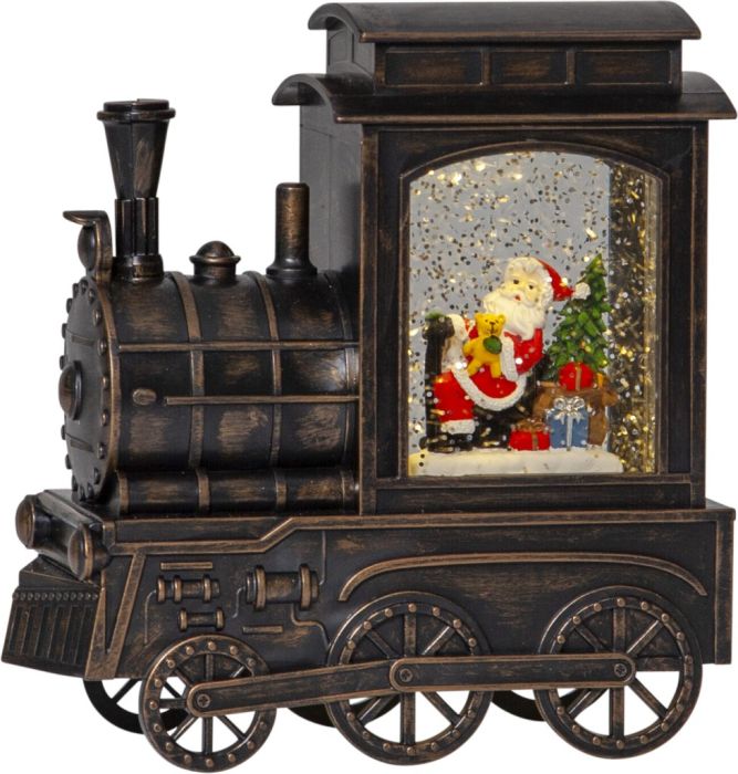 Glittrande vattenfyllt lokomotiv med jultomte inuti.